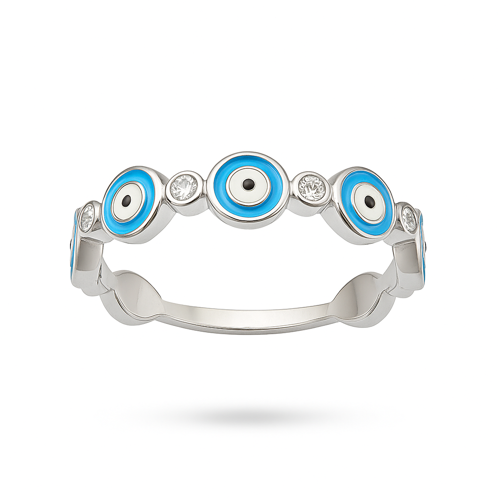This sterling silver ring, named Aura, features a continuous pattern of vibrant blue evil eye motifs interspersed with dazzling clear stones. Symbolizing protection and clarity, each eye is framed in polished silver, creating a modern yet meaningful design. The smooth, seamless band makes it a striking everyday statement piece, believed to guard against negative energy while adding a touch of charm and mystique.