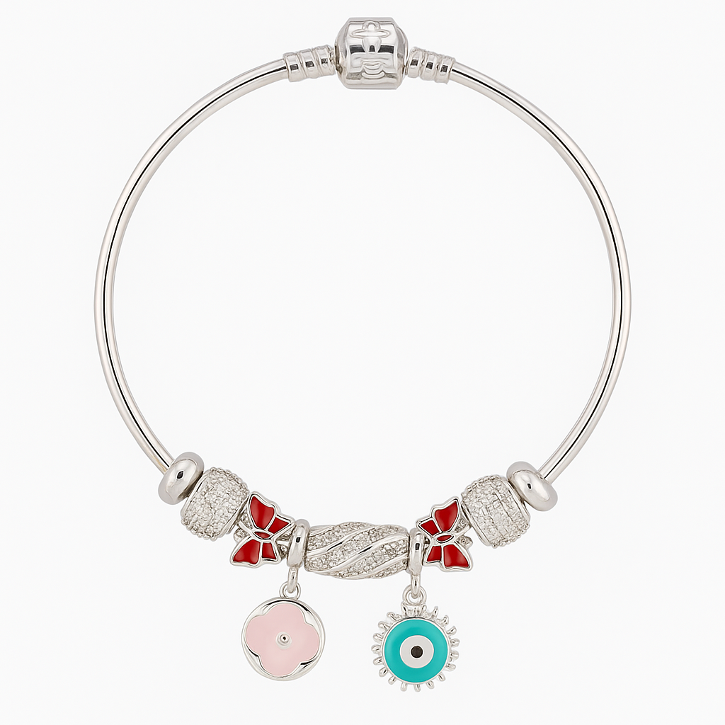 Add a pop of charm and protection to your collection with the BlissGuard bangle. This radiant silver bracelet is accented with shimmering pave crystal beads, delicate red enamel bows, and a central twisted charm that sparkles from every angle. Two dangling icons—a soft pink flower for grace and a turquoise evil eye for protection—balance elegance with positive energy.