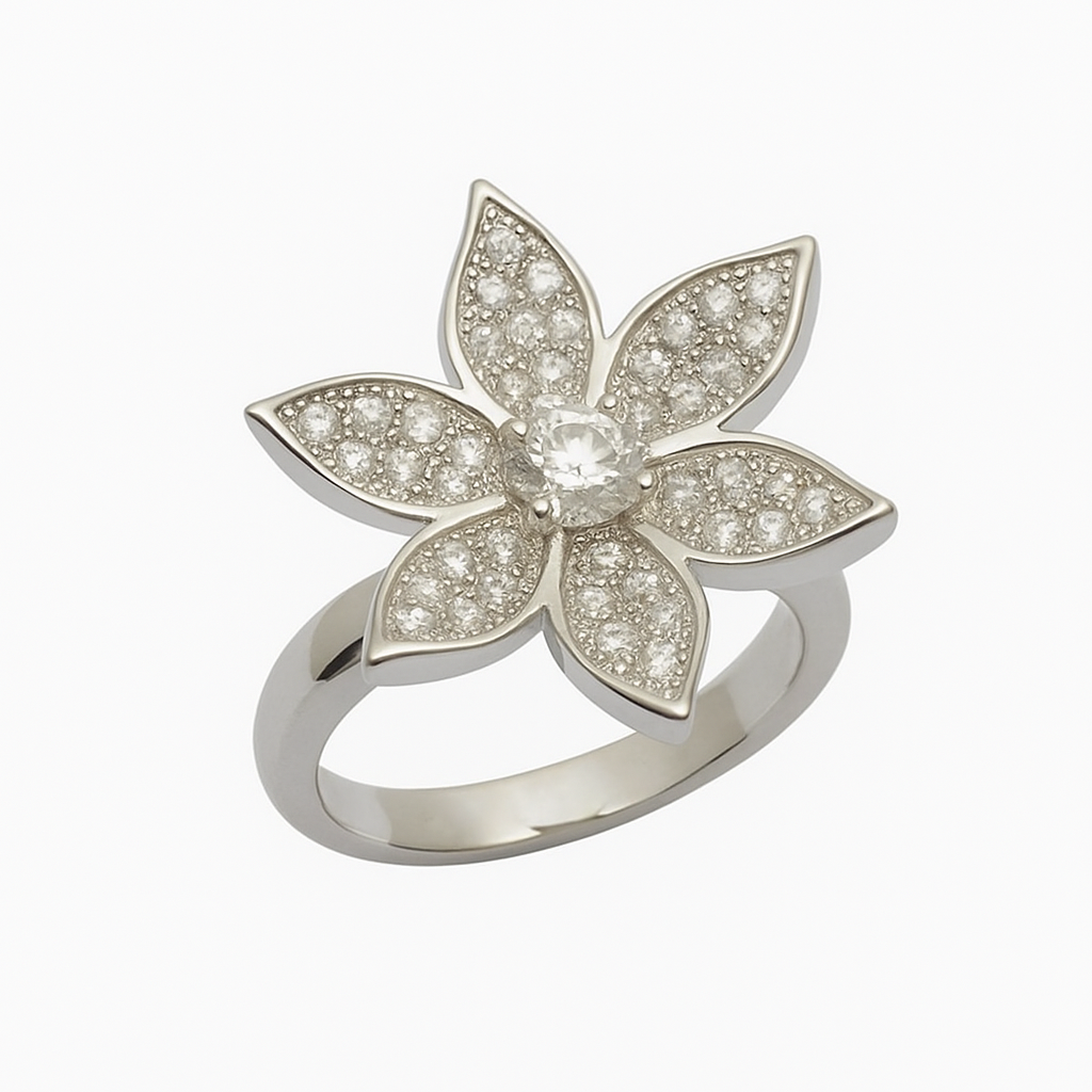 This sterling silver ring, named Blossom, features an elegant six-petal flower design encrusted with shimmering stones. At its heart lies a brilliant round gem, radiating out into textured petals that catch the light with every movement. Inspired by nature’s delicate beauty, Blossom is a graceful blend of sparkle and floral charm — perfect for adding a touch of feminine elegance to any look.