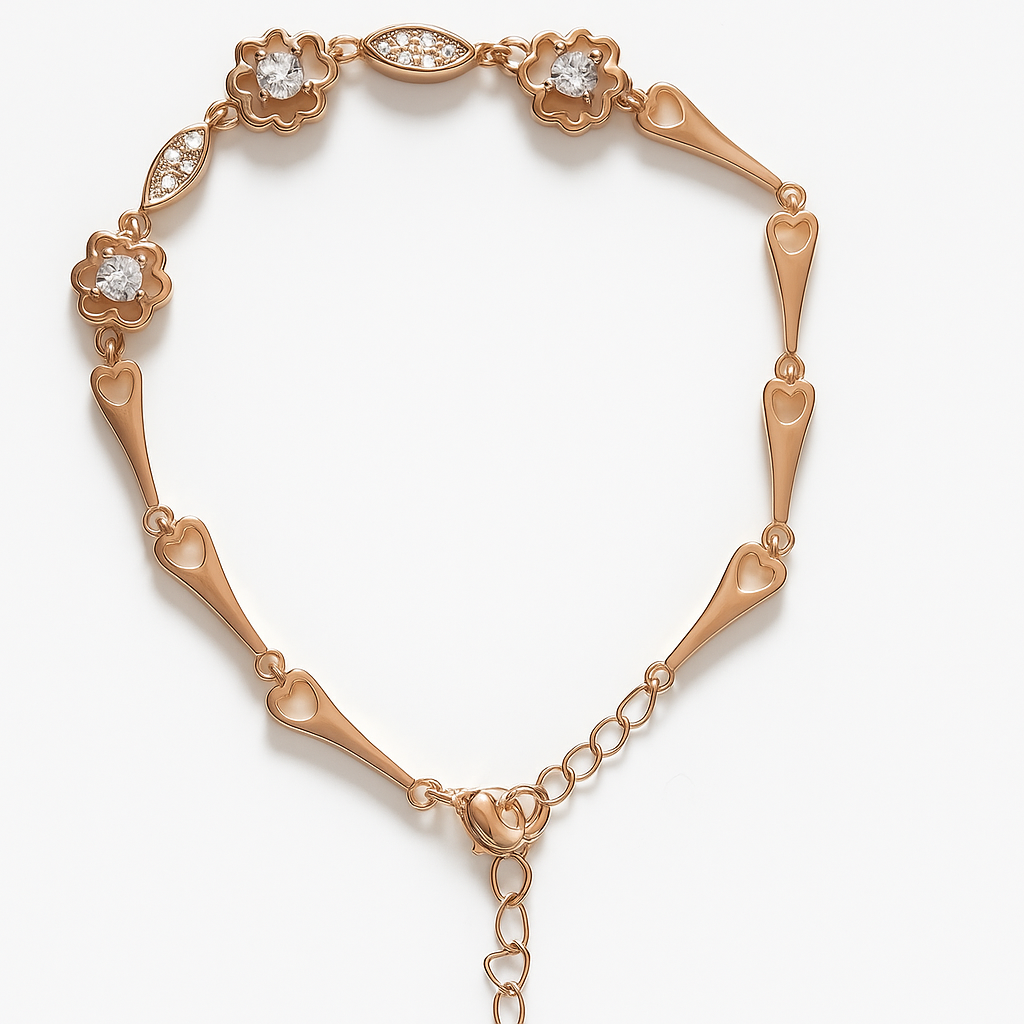 The BlossomHeart Bracelet is a romantic blend of floral grace and timeless charm. Crafted in soft rose gold color, this silver bracelet features alternating flower-shaped links with sparkling stones and tapered heart-embossed connectors. A delicate extender with a heart detail completes the piece, making it a sweet and elegant accessory — perfect for adding a gentle touch of love and beauty to any outfit.