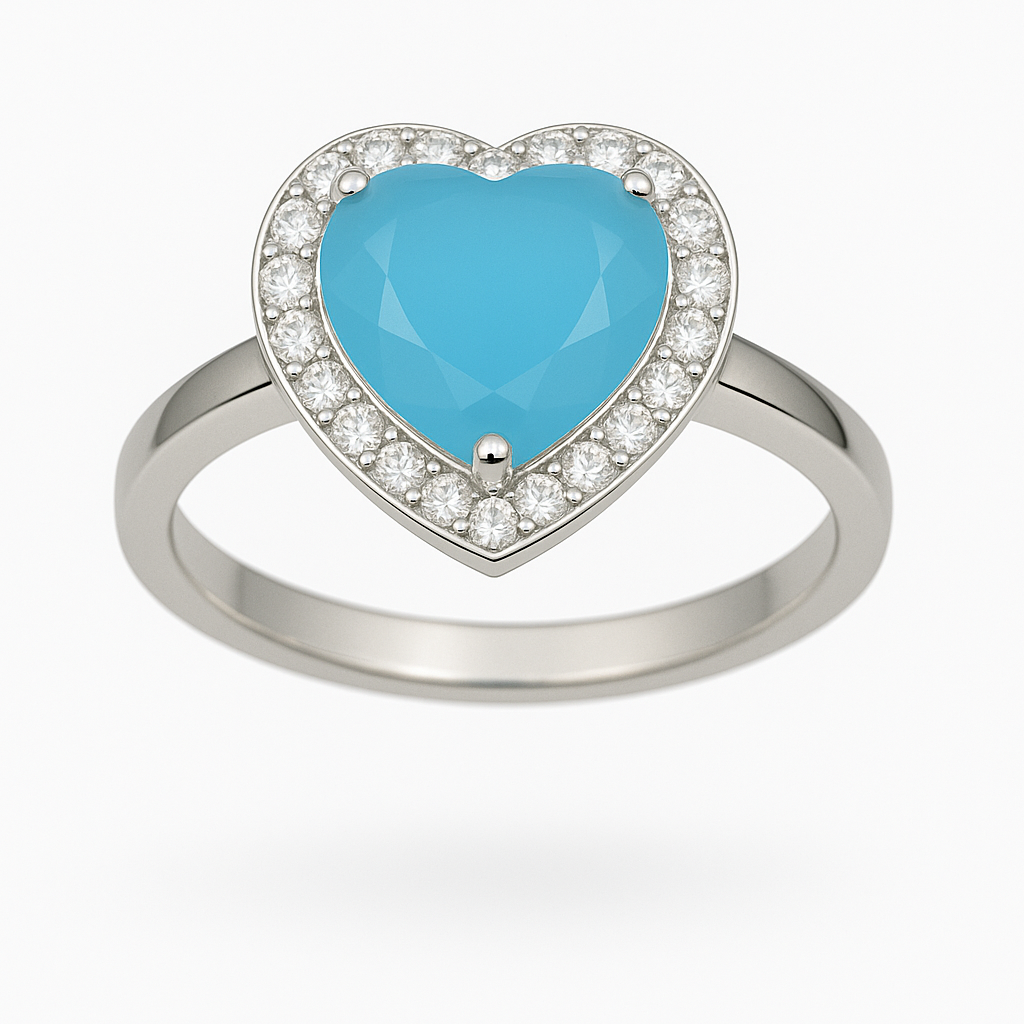 This is an elegant silver ring featuring a heart-shaped turquoise gemstone as its centerpiece.