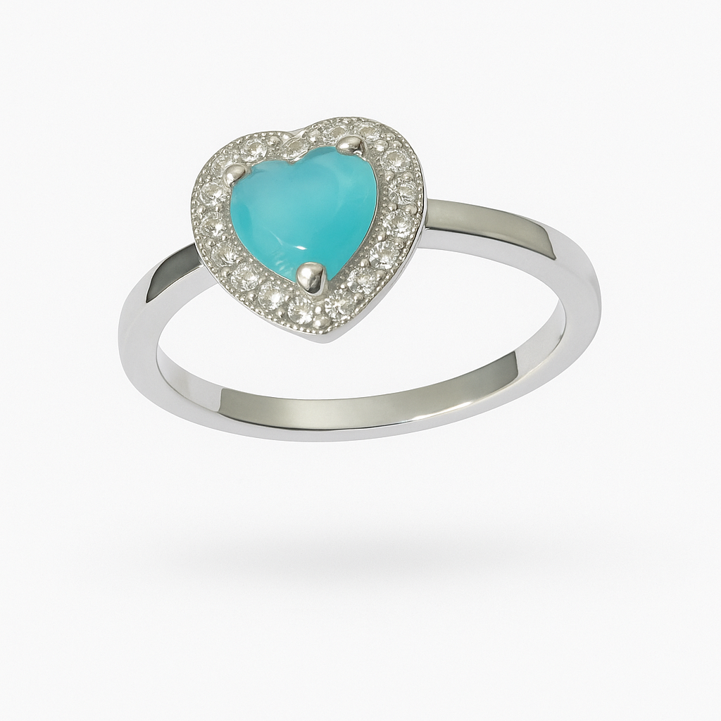 The Blue Heart (Small) Ring features a polished silver-tone band set with a heart-shaped faux gemstone in a soft aqua blue hue. Surrounded by a delicate halo of sparkling imitation stones, the design radiates charm and tenderness. With its smooth curves and romantic color, this affordable ring brings a playful yet graceful touch to any look—perfect for gifting or everyday wear.