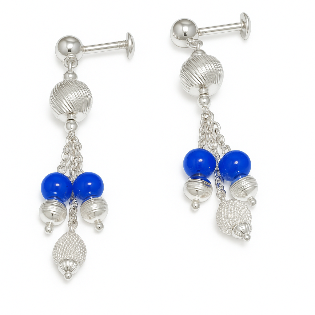These radiant silver earrings feature polished chains and textured beads paired with vibrant ocean-blue glass accents. The triple-dangle design adds graceful movement, while the screw-back tops ensure a secure fit. A perfect blend of sparkle and color, ideal for both festive and everyday elegance.