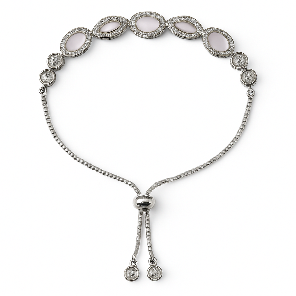 The Blush Halo Bracelet exudes elegance with soft pink oval stones framed by glittering halos of cubic zirconia. Set in polished sterling silver, its refined bolo design ensures a perfect adjustable fit. Delicate yet eye-catching, this bracelet is ideal for adding a romantic, graceful shimmer to any outfit — from everyday wear to special occasions.