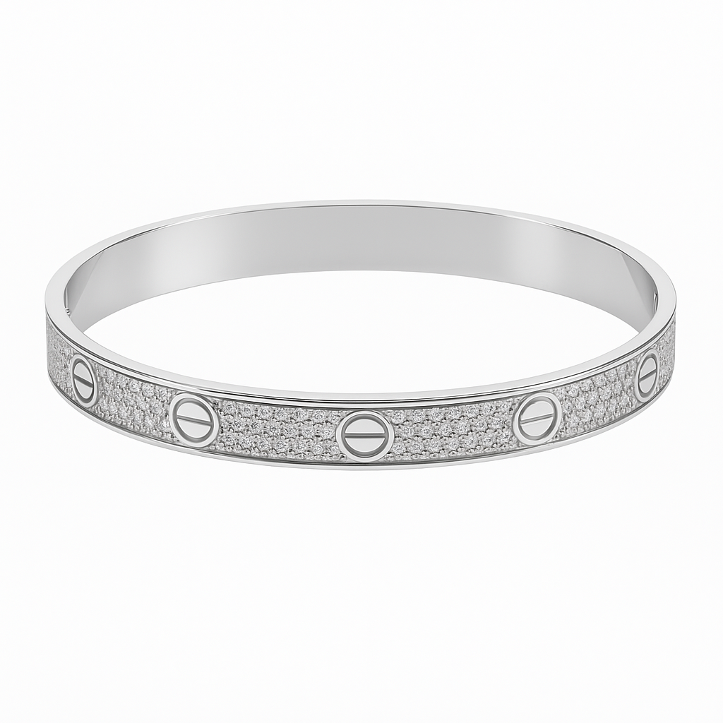 A sleek, modern silver bangle adorned with alternating engraved icon details and a surface of micro-pavé stones. Its symmetrical pattern and polished finish give it a minimalist yet elegant look, perfect for everyday wear or pairing with other stackable pieces.