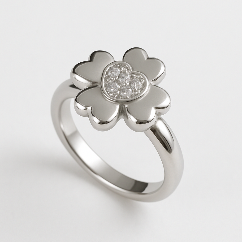 The Clover Heart ring features a clover-like floral design crafted from four polished heart petals. At the center rests a sparkling heart encrusted with delicate stones, adding a touch of magic to the minimalist silver band. Symbolizing love, luck, and beauty, this ring is perfect for everyday elegance or a meaningful gift with heartfelt charm.
