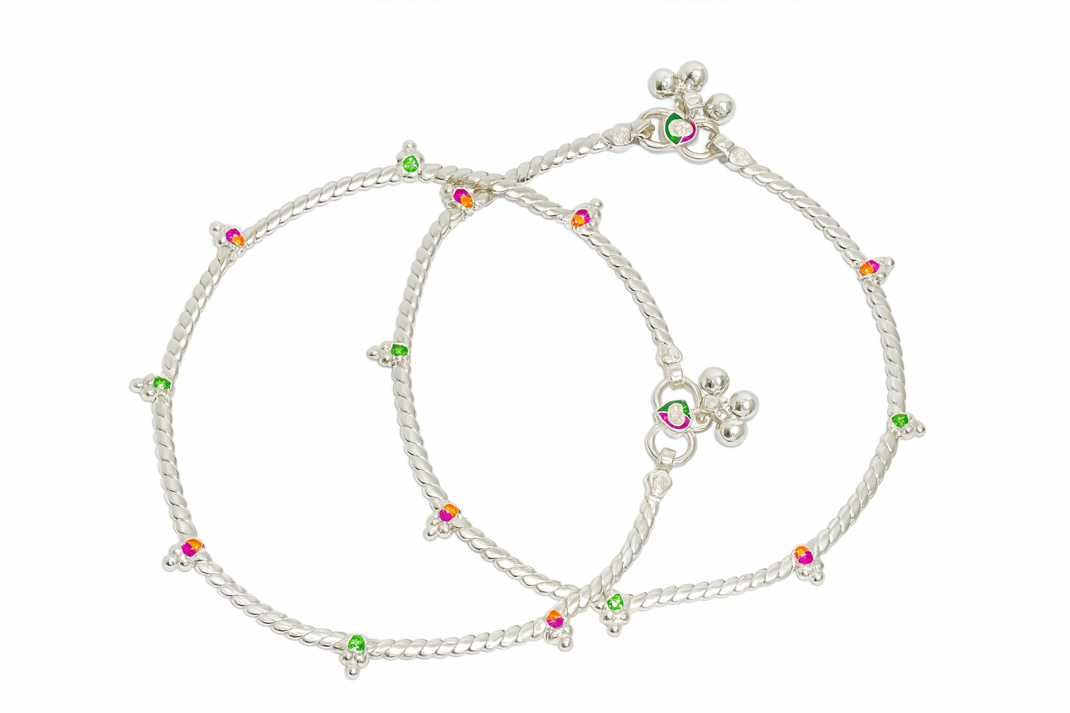 Grace your feet with the Mehfil Glow Anklets – a radiant pair of handcrafted silver anklets adorned with delicate tricolor enamel accents and polished beads. Each anklet is intricately designed to capture light with every step, reflecting festive elegance and charm. Lightweight and comfortable, these anklets are perfect for daily wear or special occasions, adding a touch of traditional vibrance to your modern style.