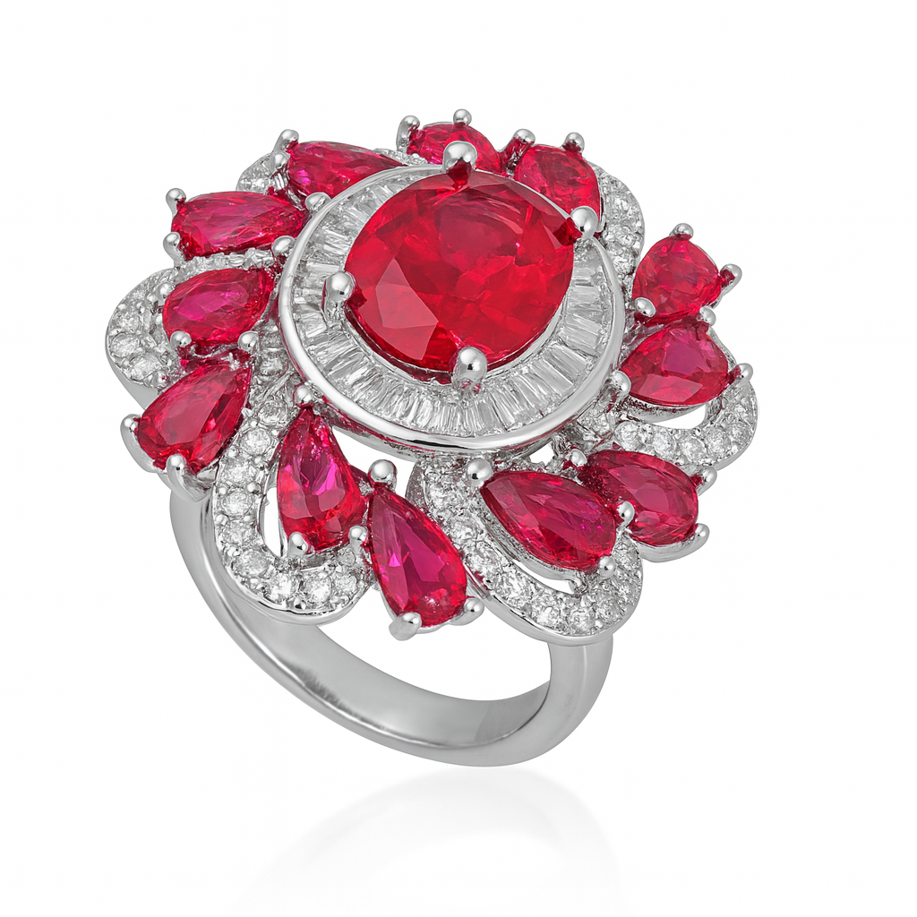 The Crimson Floral Ring captures floral elegance with a bold twist. A radiant dark rose center stone is surrounded by a halo of dazzling diamonds and teardrop-shaped rubies, all set in polished silver. Designed to resemble a blooming flower, this statement ring adds timeless glamour and vibrant charm to any occasion.