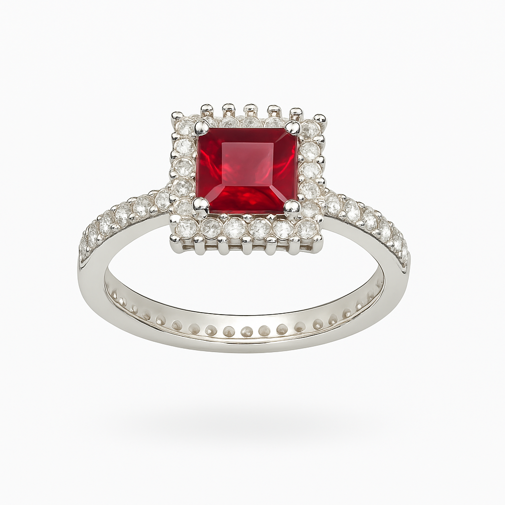 Elevate your elegance with the Crimson Grace Ring, featuring a radiant crimson gemstone framed in a halo of precision-set white stones. Set on a polished sterling silver band, this regal piece blends timeless charm with a bold splash of color—perfect for making a confident and graceful statement at any occasion.