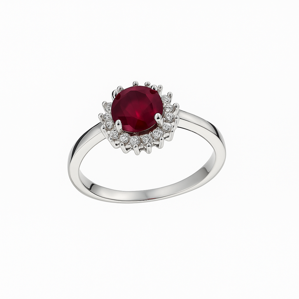 The Crimson Halo ring showcases a deep red ruby encircled by a radiant halo of sparkling diamonds, all set on a sleek silver band. This timeless design blends classic elegance with bold color, making it a perfect statement piece for both everyday wear and special occasions.