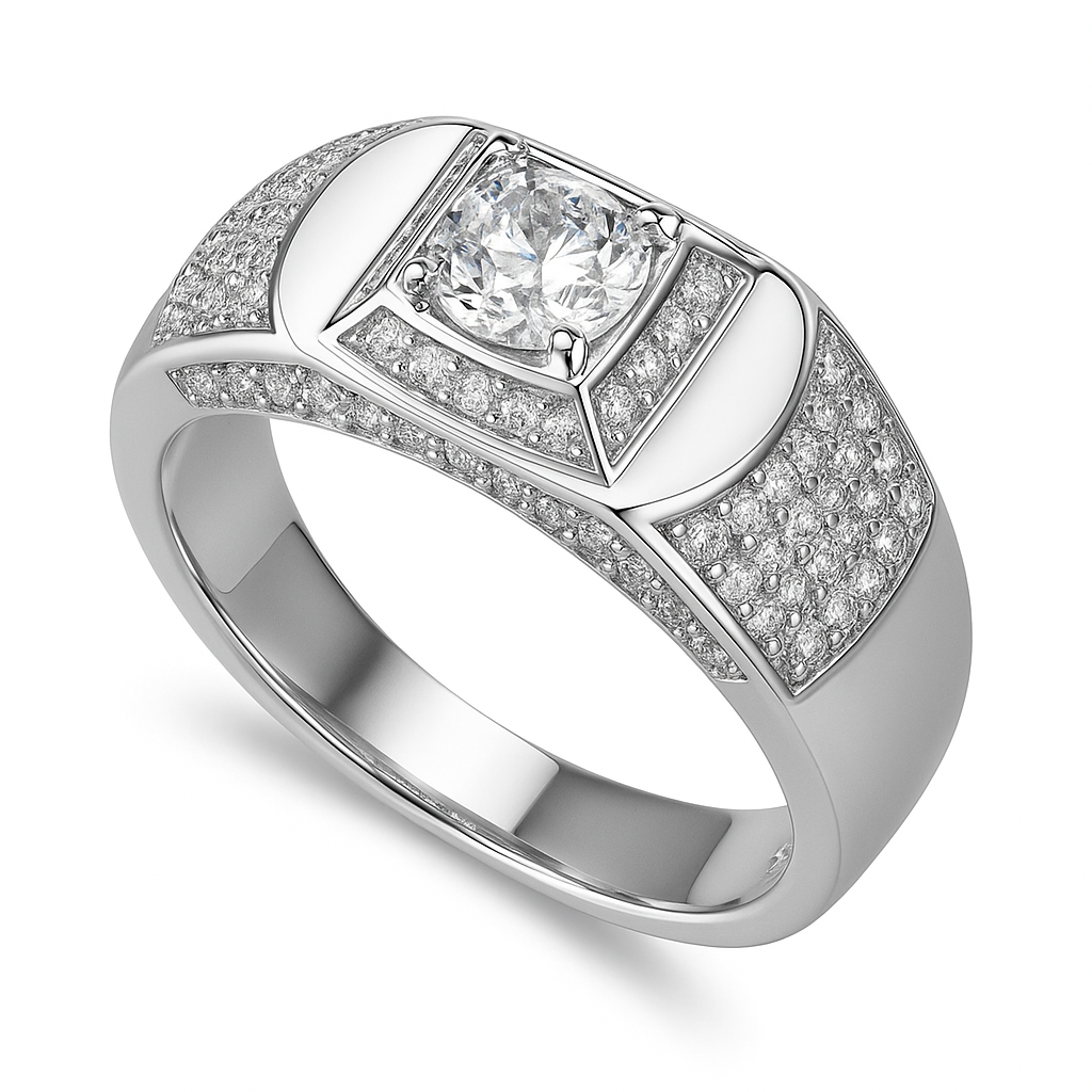 A bold and luxurious silver ring designed for distinction. Featuring a brilliant round-cut center stone set in a geometric frame, and flanked by rows of shimmering pave-set diamonds, this ring commands attention with its sharp lines and refined finish. Perfect for those who appreciate power, precision, and timeless style in one commanding piece.