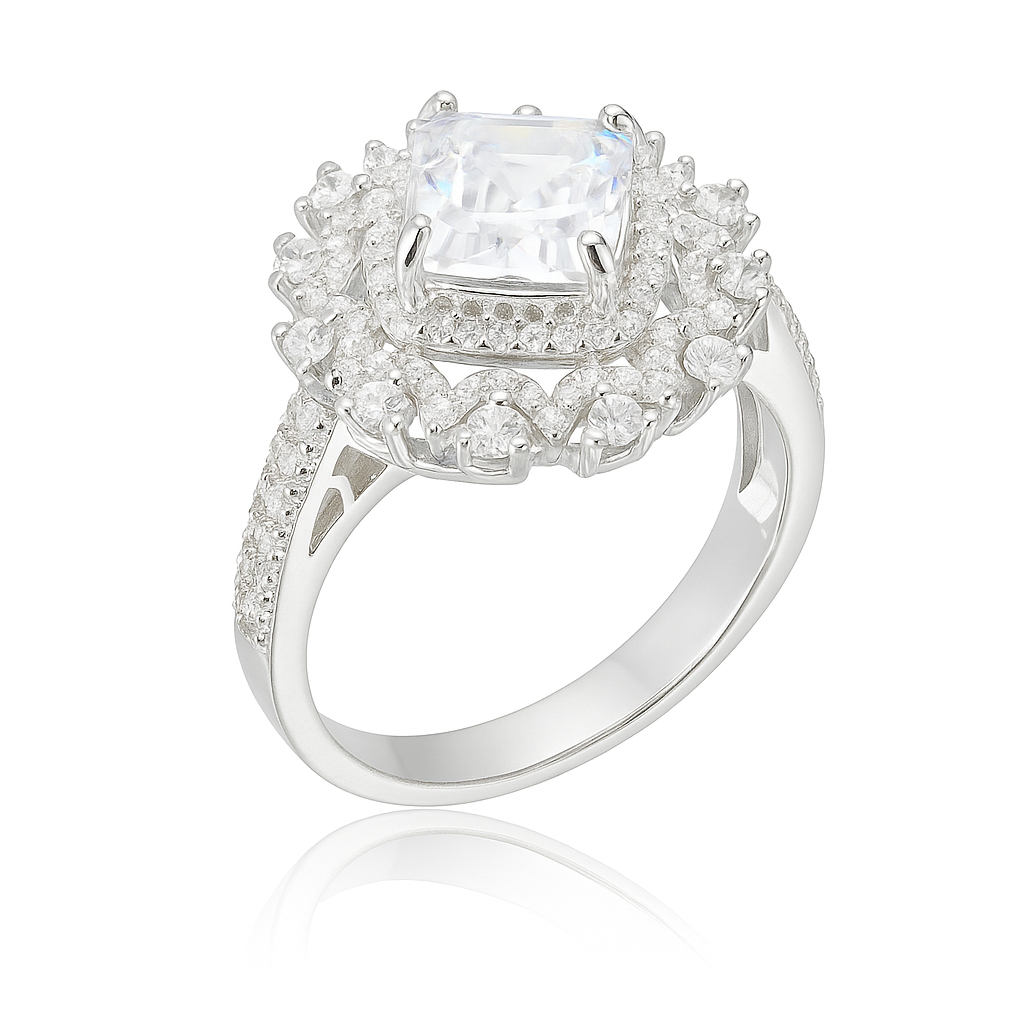 The Crystal Nest ring captures the beauty of a radiant blossom with its square-cut center stone surrounded by layers of shimmering accents. Delicate petals of sparkle form a floral-inspired halo, while a polished silver band enhances the brilliance. It’s a timeless piece that speaks of grace, celebration, and luminous charm.