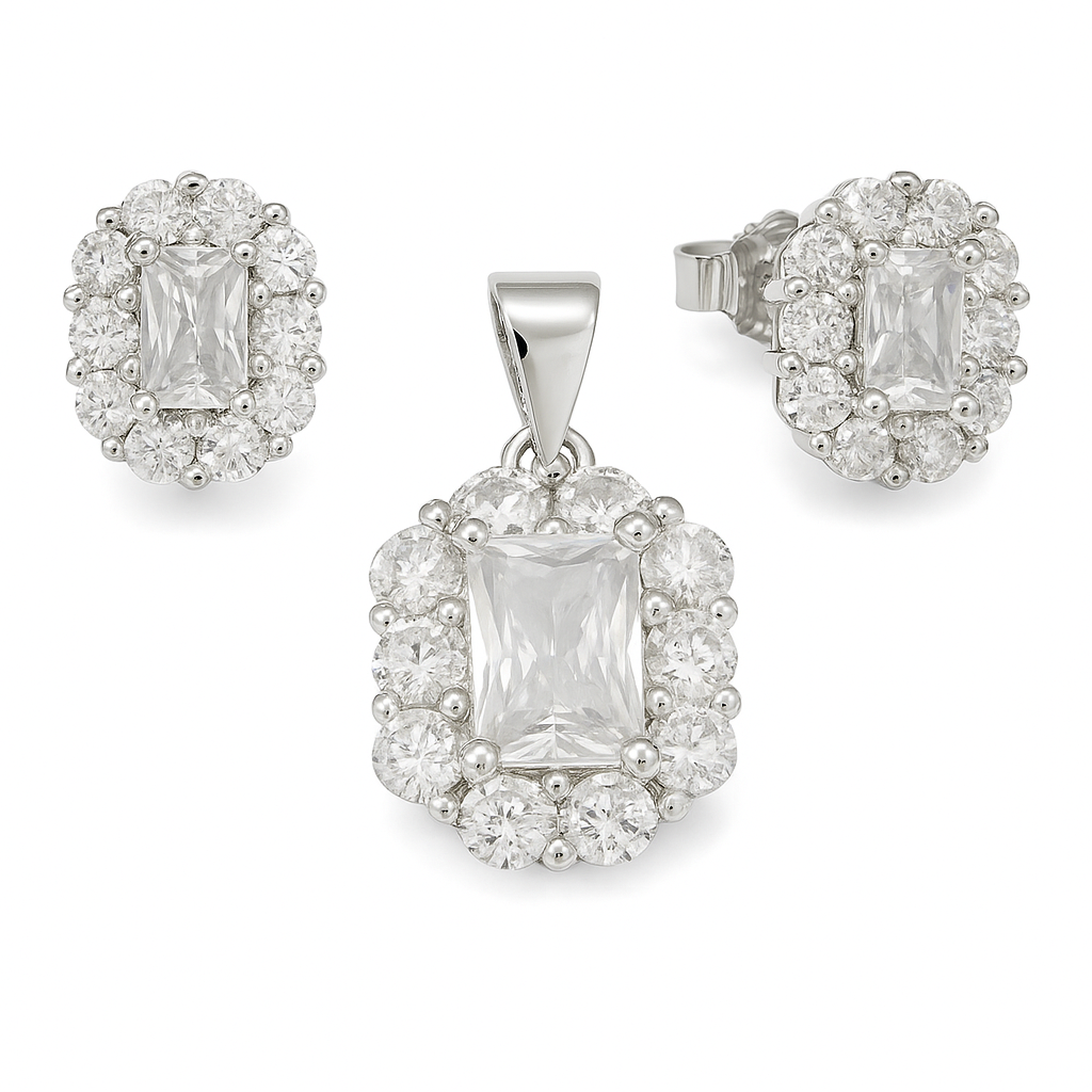 The Crystal Radiance Set features a timeless design with a stunning emerald-cut centerpiece surrounded by a halo of brilliant round-cut stones. Crafted in high-quality sterling silver, this pendant and stud earring set sparkles with refined elegance. Whether for a special event or everyday sophistication, it adds a graceful touch to any outfit.