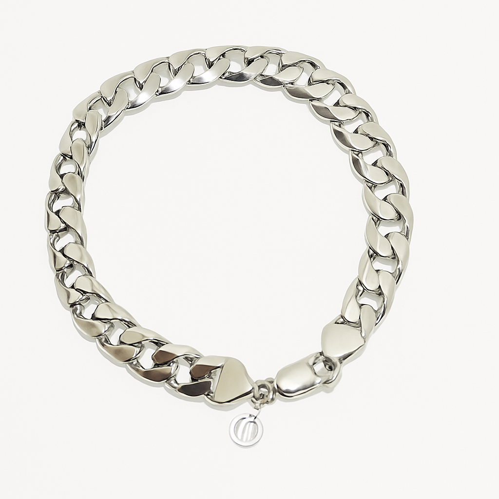 A Cuban Link Bracelet features a continuous row of interlocking, slightly flattened oval links that lie snug and flat against the wrist. This particular piece is crafted from polished sterling silver for a bright, reflective finish. It’s secured with a sturdy lobster‑style clasp and finished off with a small, matching silver charm for a touch of understated flair. The result is a timeless, gender‑neutral design that works equally well dressed up or down—perfect for everyday wear or layering alongside other pieces.
