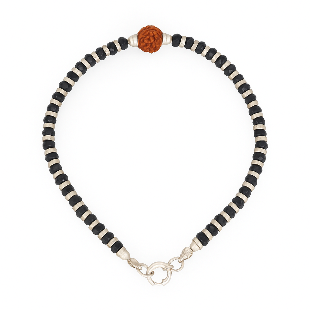 The Divine Rudraksha Bracelet blends spiritual tradition with timeless style. Handcrafted with alternating black and silver-toned beads, it features a sacred Rudraksha centerpiece believed to bring peace, focus, and protection. Finished with a secure silver clasp, this bracelet is a meaningful accessory for everyday wear or spiritual gifting.