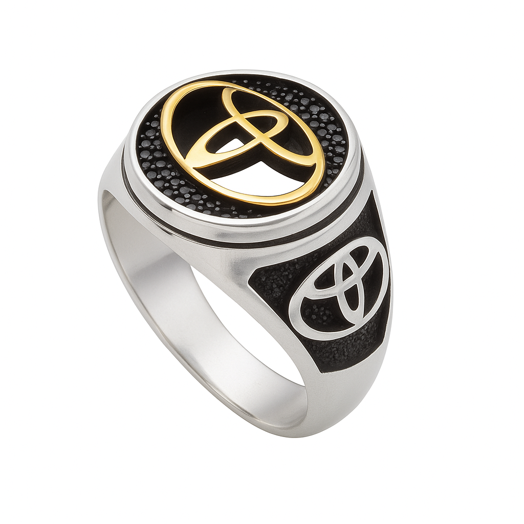 The DriveMark Ring blends bold automotive heritage with polished sophistication. Crafted in sterling silver, it features a raised gold Toyota emblem set against a textured black background, framed by smooth silver detailing. Side engravings echo the central design, giving the ring a balanced, modern edge. Ideal for car enthusiasts and style-conscious individuals alike, this ring makes a sleek statement of identity and passion.