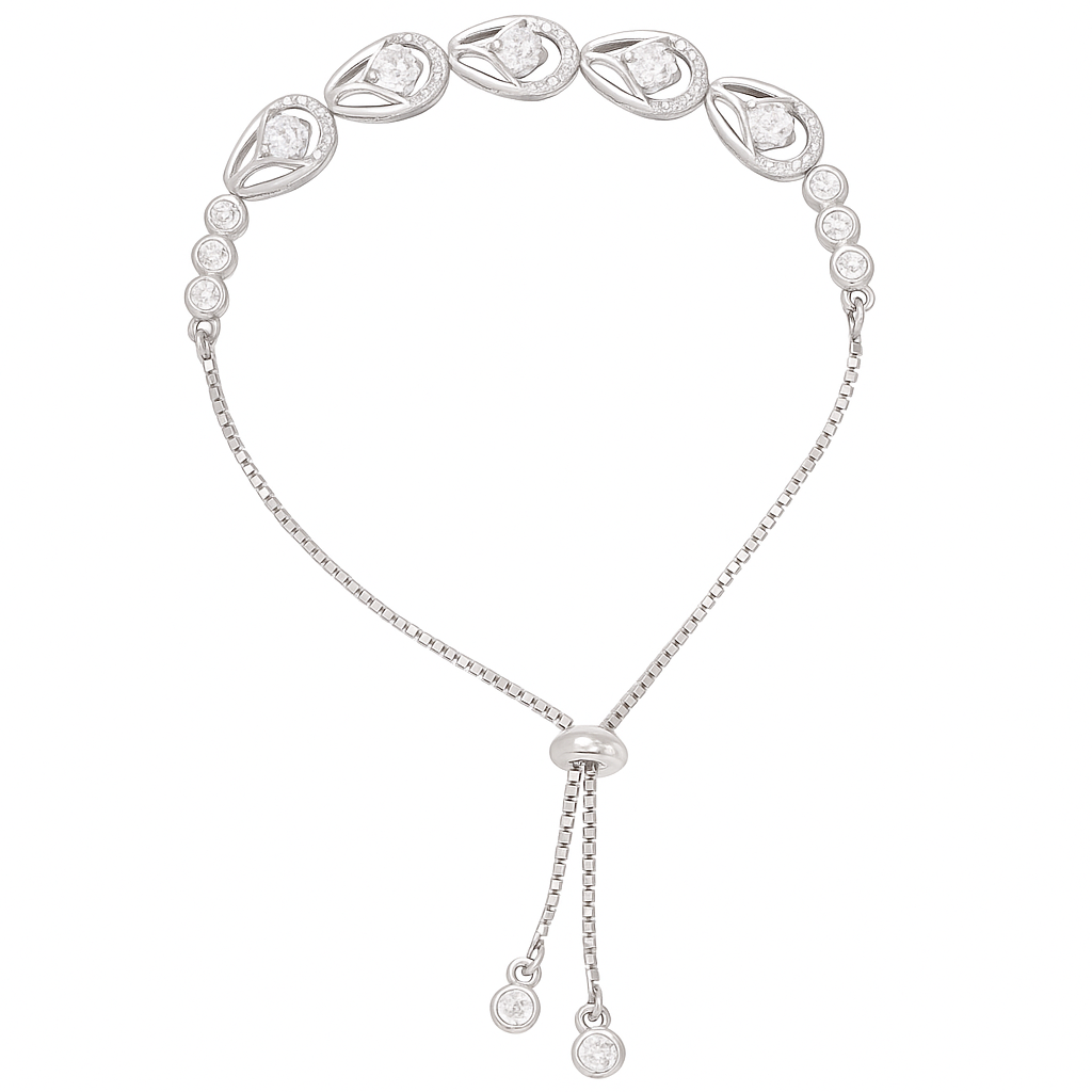 A graceful silver adjustable bracelet featuring six intricately crafted teardrop-shaped settings, each holding a shimmering stone. The elegant drop design at the top adds a delicate, feminine touch, while the adjustable chain ensures a perfect fit. Ideal for both special occasions and everyday wear.