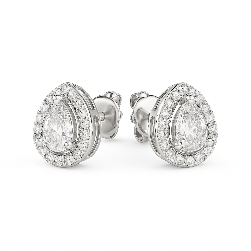 These Elegant Drop Sparkle Studs feature a stunning pear-shaped centerpiece that captures light beautifully, surrounded by a delicate halo of smaller round stones. Crafted in radiant silver, these earrings offer a timeless design with a graceful curve, perfect for adding a refined sparkle to both everyday outfits and special occasions. The secure butterfly back ensures comfort and style all day long.
