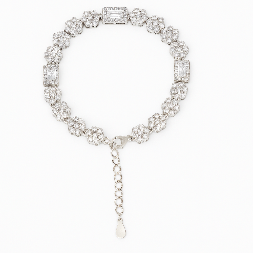 This graceful silver bracelet features a radiant series of crystal-studded floral clusters, delicately connected with rectangular-cut accents for added brilliance. The adjustable chain ensures a comfortable fit, making it perfect for both special occasions and everyday elegance.