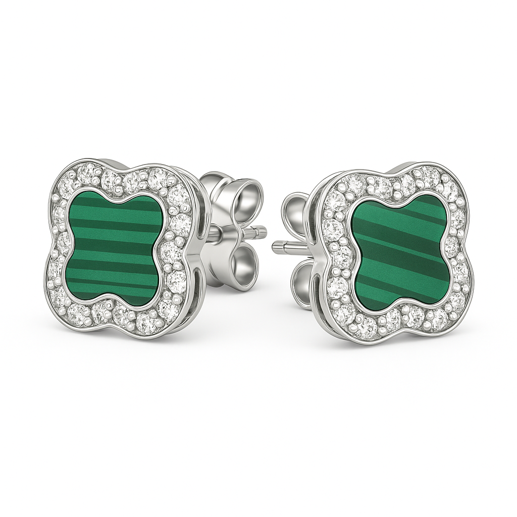 These elegant silver stud earrings feature a unique clover-shaped design centered with green malachite-like inlays, encircled by a delicate halo of sparkling white stones. The rich green centerpiece adds a pop of color, while the shimmering outline enhances their luxurious appeal. Perfect for both everyday wear and special occasions, these studs are secured with classic butterfly locks for comfort and stability.