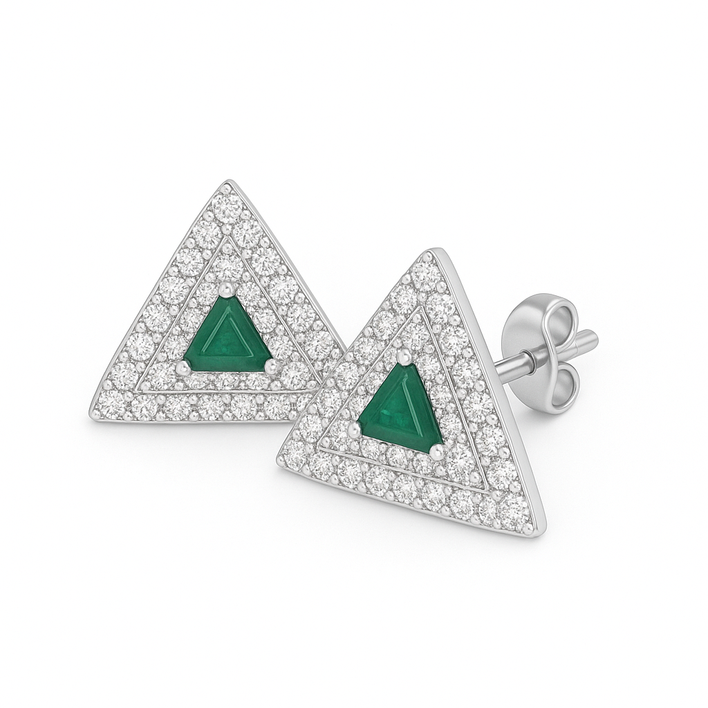 Crafted in polished silver, these striking triangular stud earrings feature vibrant green emerald centers surrounded by two seamless rows of shimmering white stones. The bold geometric shape and radiant sparkle offer a perfect blend of modern elegance and timeless luxury — ideal for both everyday glamour and special occasions.