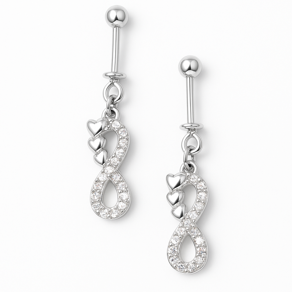 These elegant silver earrings feature a sparkling infinity symbol adorned with three delicate heart accents. The graceful drop design adds a romantic charm, making them a perfect accessory for both special occasions and everyday elegance. Crafted to symbolize eternal love and connection.