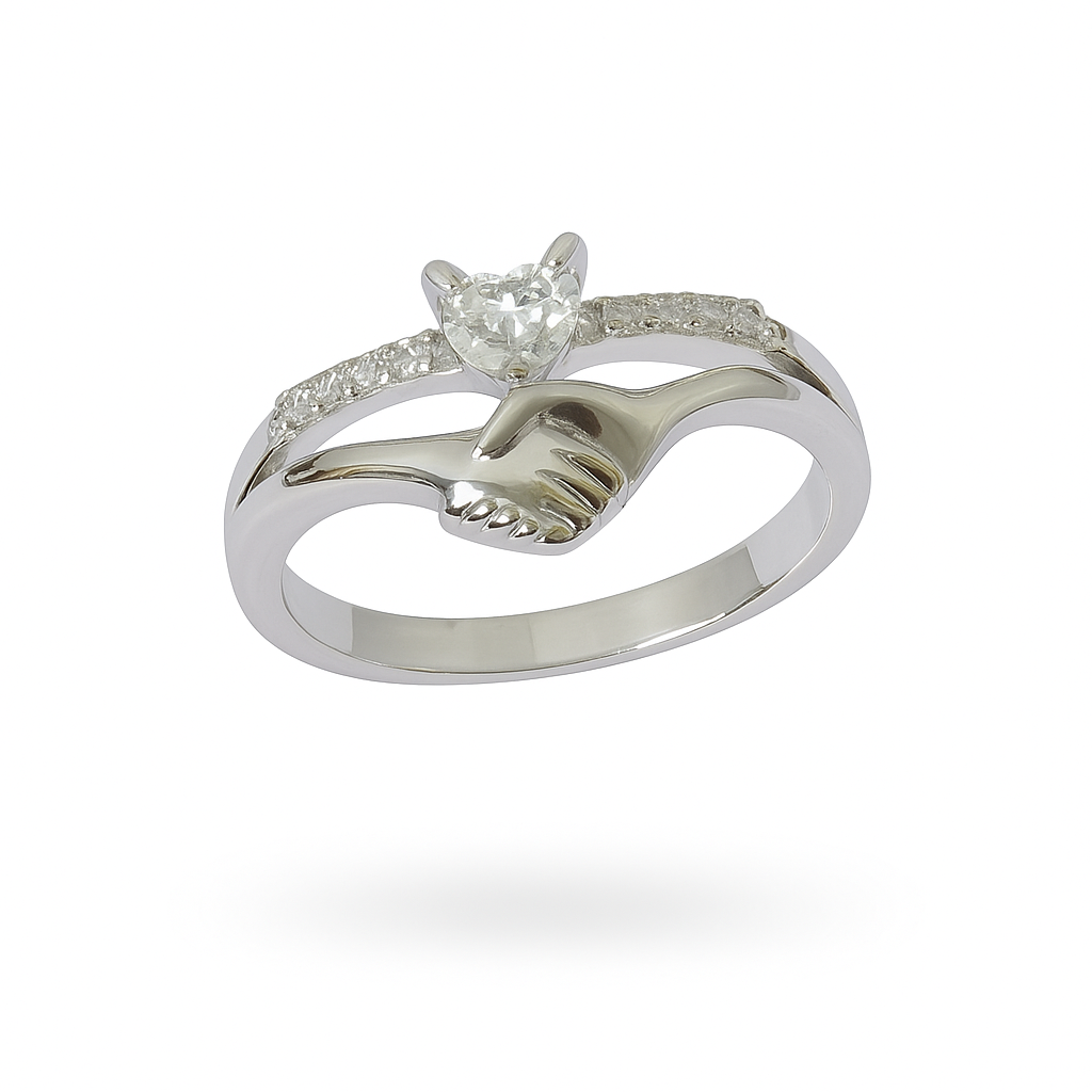 Celebrate love, unity, and unbreakable connection with the Eternal Bond Ring. This unique sterling silver ring features a heart-shaped brilliant-cut center stone, delicately cradled between two hands joined in a symbolic handshake. Accented with a row of sparkling white stones along the band, this design blends elegance with a powerful message of trust and togetherness.