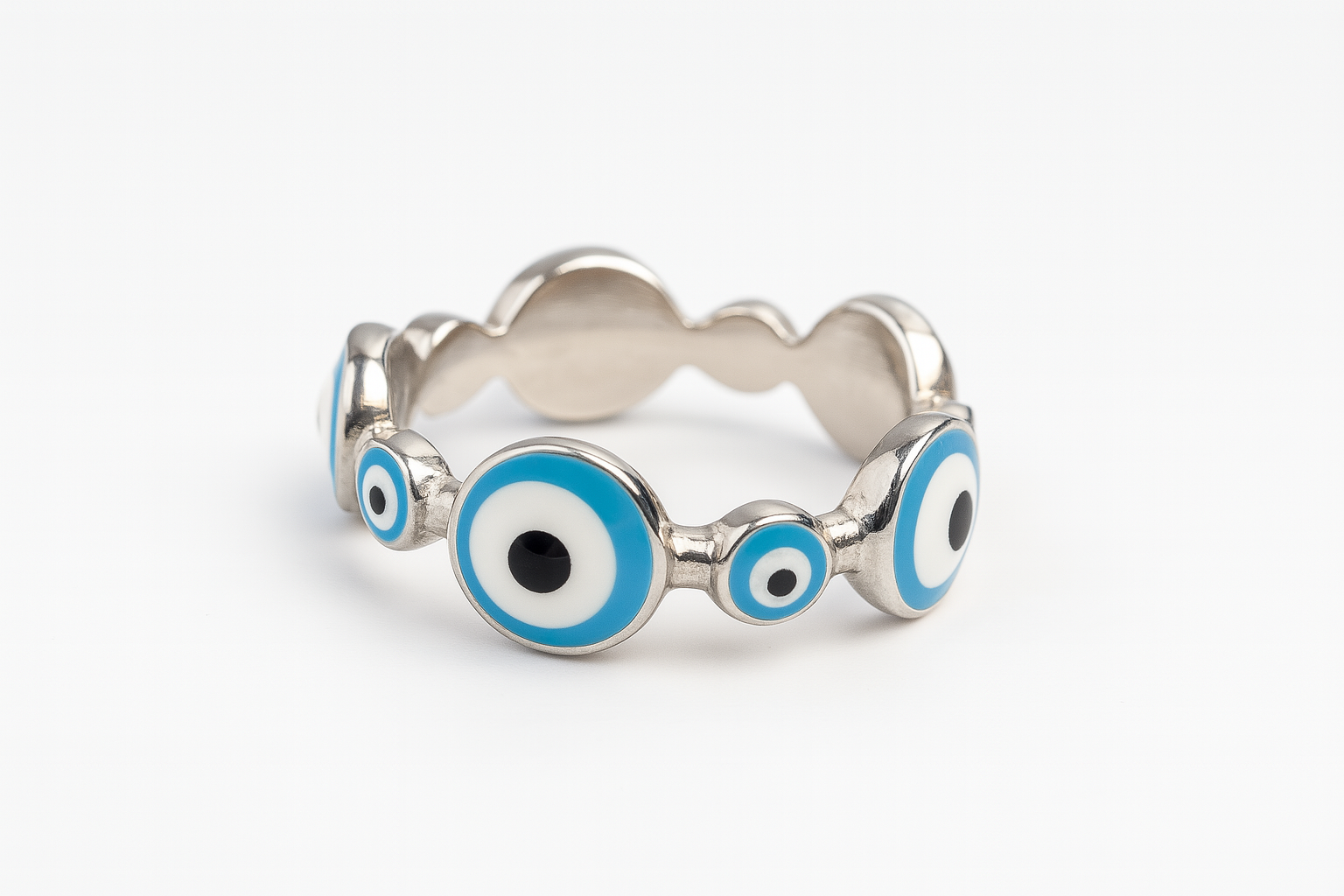 This sterling silver ring, named Evil Eye Band, features a continuous pattern of vibrant blue evil eye motifs interspersed with dazzling clear stones. Symbolizing protection and clarity, each eye is framed in polished silver, creating a modern yet meaningful design. The smooth, seamless band makes it a striking everyday statement piece, believed to guard against negative energy while adding a touch of charm and mystique.