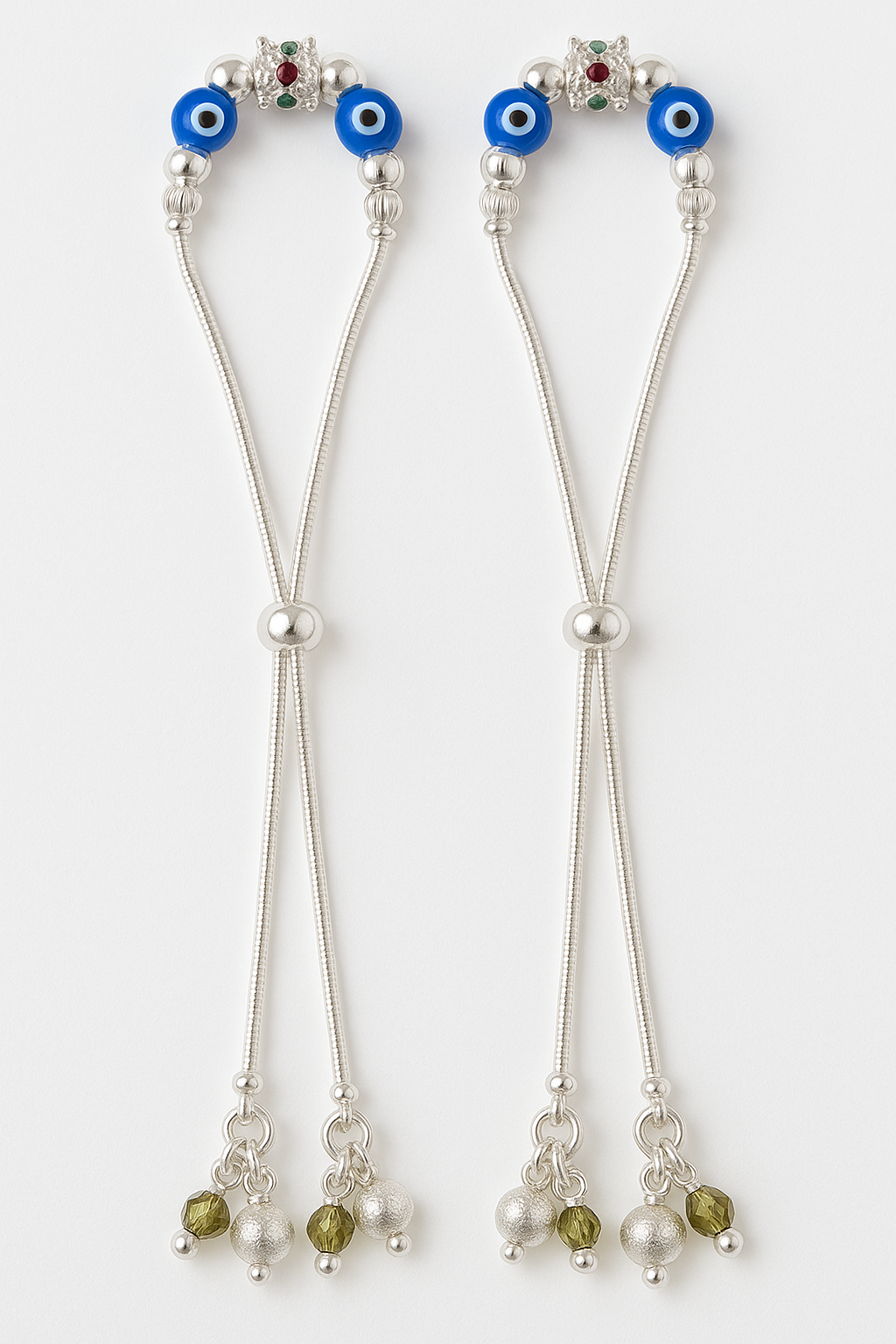 This handcrafted silver anklet features a graceful dual-chain design adorned with shimmering olive crystal beads and bold blue evil eye charms for protection. The centerpiece is a detailed silver bead inlaid with red and green stones, adding a hint of traditional elegance. A perfect blend of modern shine and cultural symbolism, this anklet brings both beauty and meaning to every step.