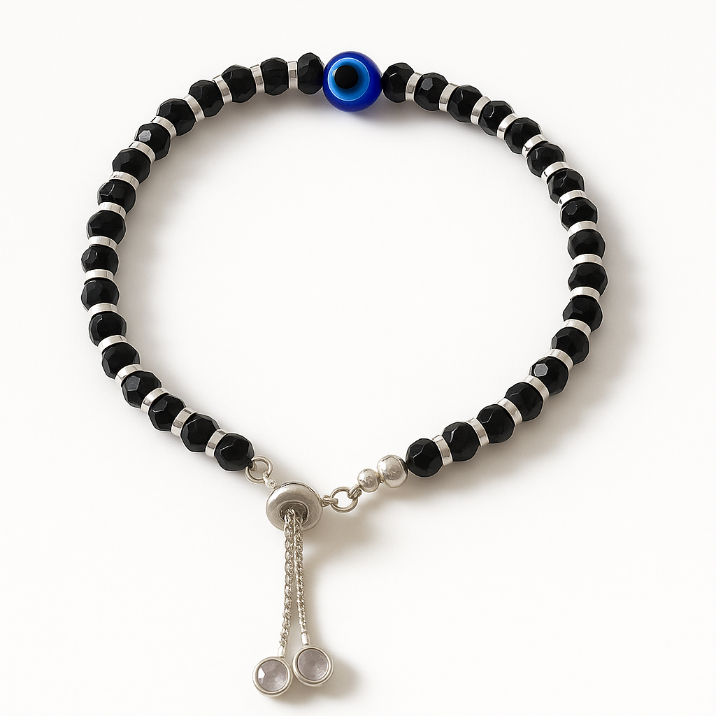 The Evil Eye Midnight Beads bracelet features polished black beads and silver accents, centered around a vibrant blue evil eye for protection and peace. Finished with a sliding clasp and twin silver chain drops, it's a graceful accessory with meaning — perfect for both everyday wear and mindful styling.