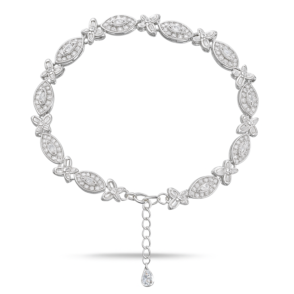 This elegant silver bracelet features a repeating pattern of marquise-shaped stones framed by delicate floral accents. Each shimmering segment is linked gracefully, creating a timeless piece that adds refined sparkle to any wrist. Finished with an adjustable clasp for a comfortable fit, it’s perfect for both everyday wear and special occasions.