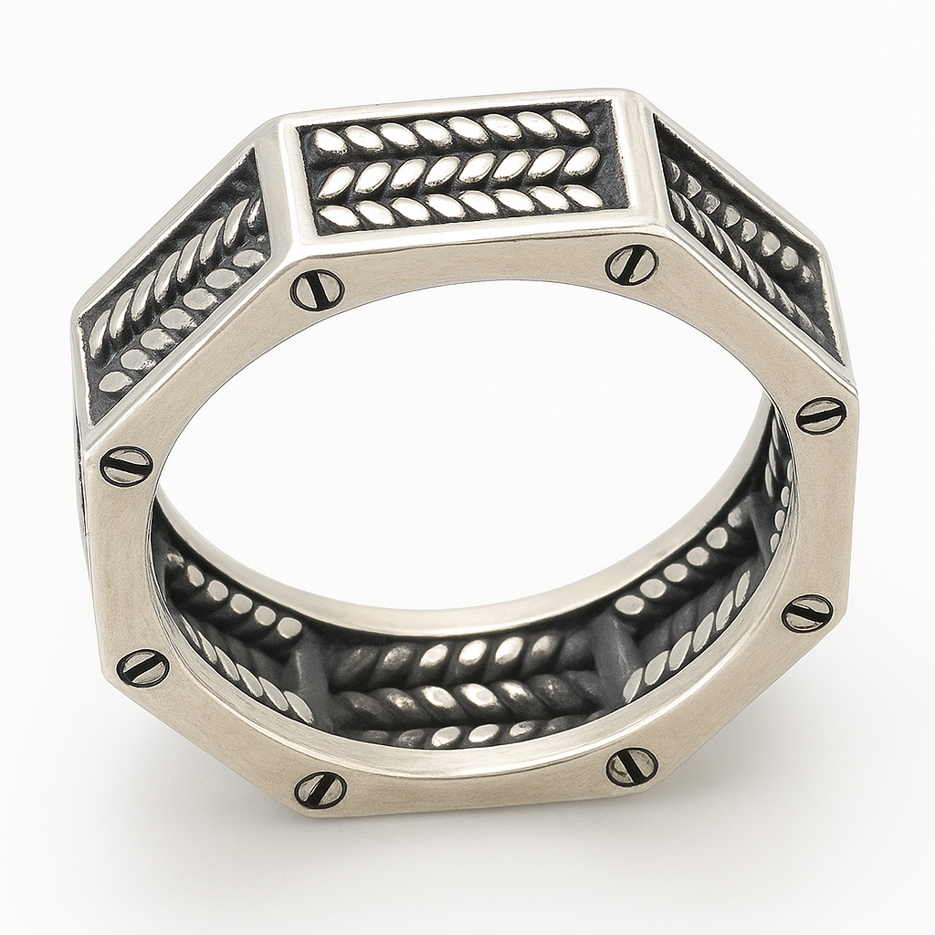 The ForgeBand Ring stands out with its bold, octagonal silhouette and industrial charm. Crafted in sterling silver, it features raised braided patterns on each face, surrounded by recessed screw details that add a rugged, mechanical edge. The oxidized black background enhances the textured contrast, while the geometric shape gives it a strong, structured presence — perfect for those who appreciate handcrafted detail and architectural design.