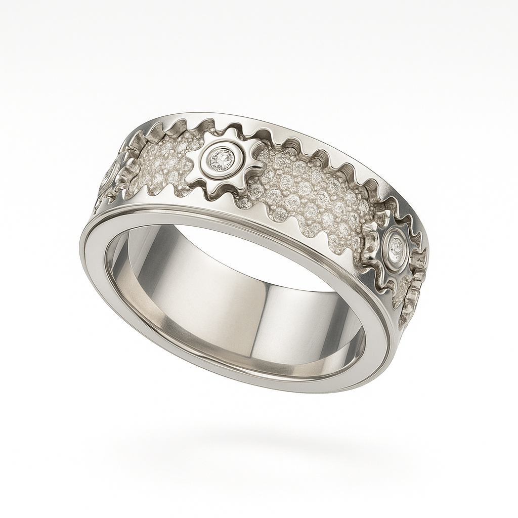 A striking silver ring that blends mechanical edge with refined sparkle. The outer band features gear-like edges and shimmering pave textures, highlighted by small bezel-set stones. Its design evokes the contrast between raw strength and delicate beauty—perfect for those who appreciate bold, modern elegance with a touch of brilliance.