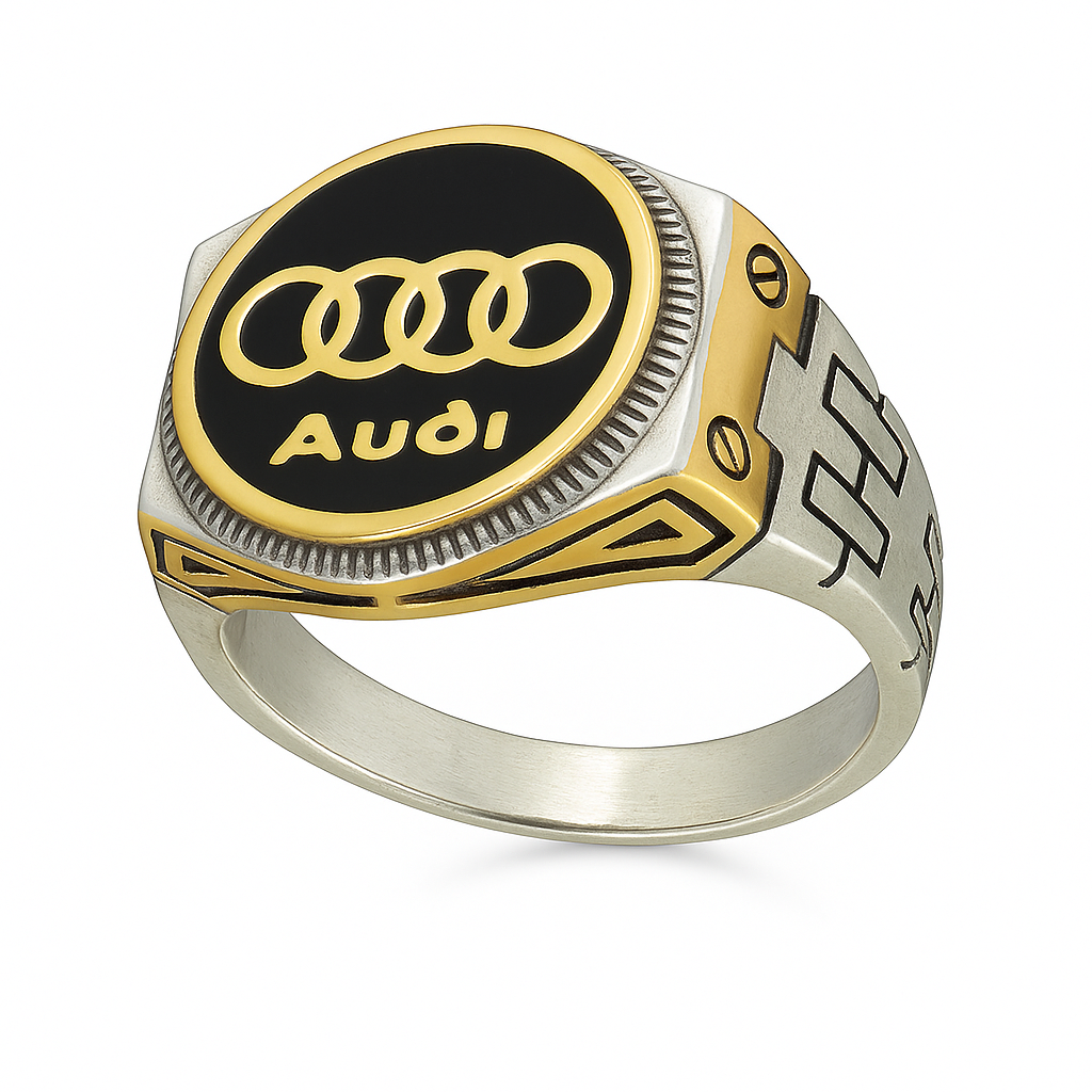 The Gear Crest ring makes a powerful statement with its bold design and deep-black enamel face, engraved with a golden emblem inspired by automotive excellence. Crafted in sterling silver with structured geometric sides, this ring blends mechanical strength with modern luxury — perfect for enthusiasts who carry confidence in their style.
