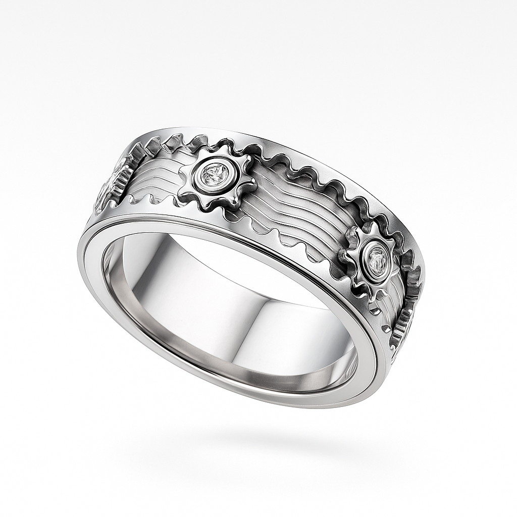 A bold and modern silver ring featuring a unique gear-like outer band with flowing wave patterns. Accented with small bezel-set stones, its design symbolizes the harmony between motion and elegance. Perfect for those who appreciate industrial-inspired style with a refined twist.