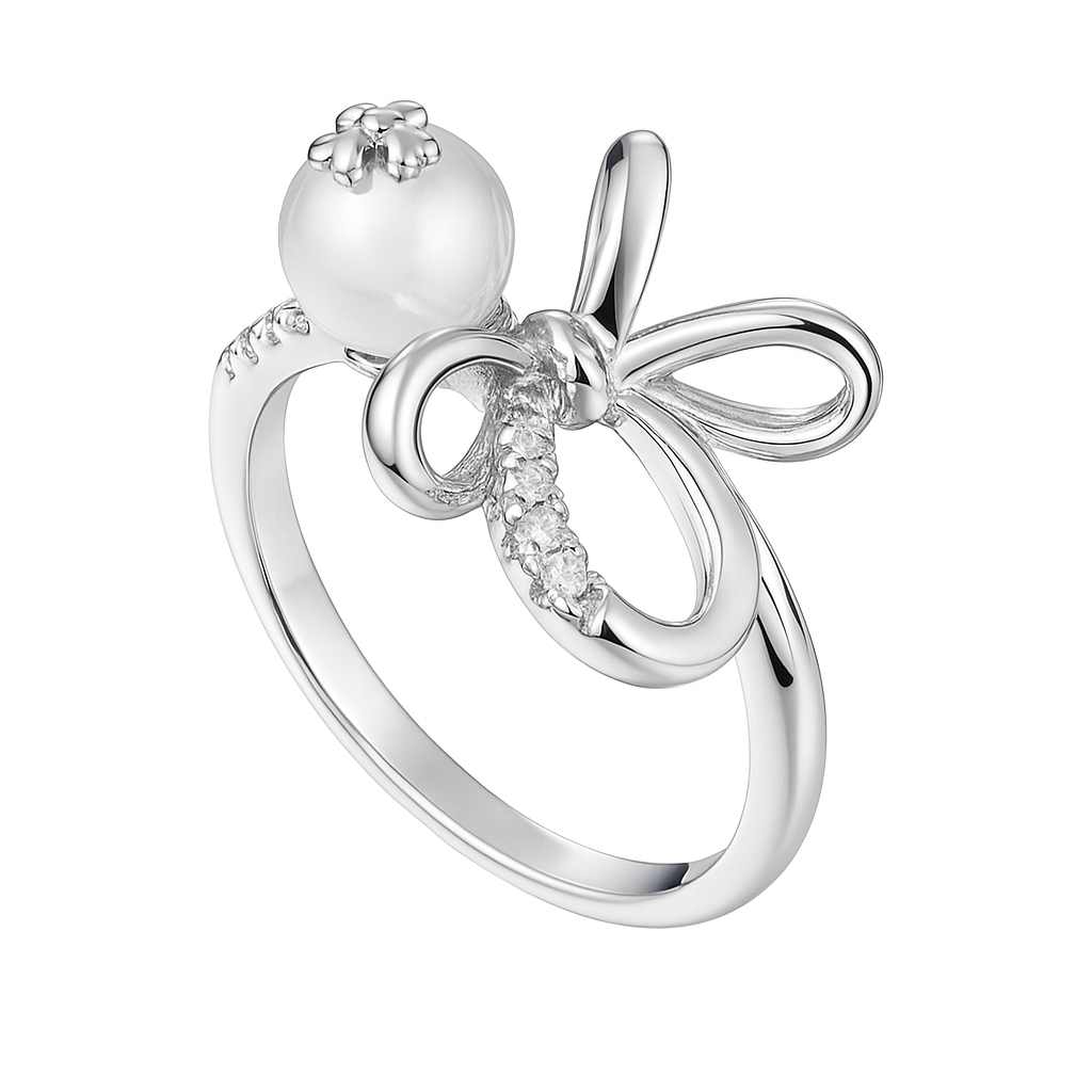 This elegant silver ring features a delicate bow-shaped design crowned with a luminous pearl. The intertwining silver loops are subtly accented with shimmering stones, adding a graceful charm. Its design evokes the beauty of a ribbon tied with care, making it a perfect symbol of elegance, femininity, and timeless poise. Ideal for gifting or personal wear, Grace reflects refined simplicity with a soft, romantic touch.