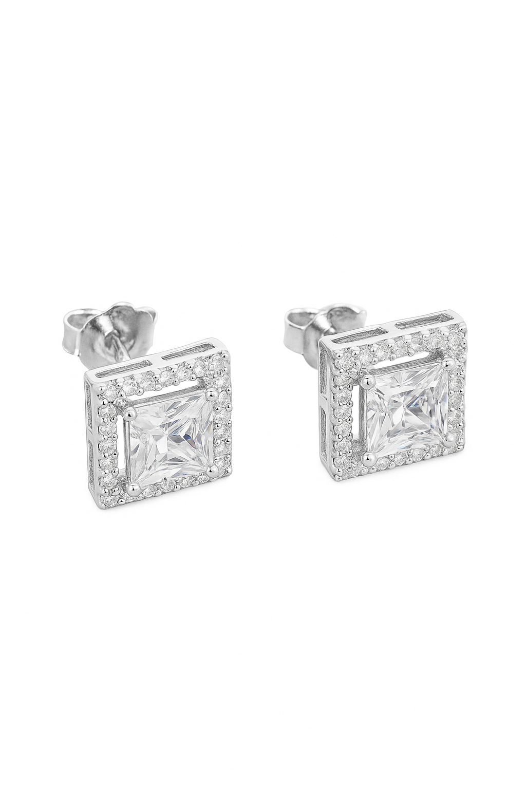 These elegant silver earrings feature a dazzling princess-cut center stone framed by a halo of sparkling mini crystals. The geometric square design adds a modern touch, while the brilliant stones create a timeless sparkle—perfect for both everyday wear and special occasions. Crafted for comfort and style, these studs are a graceful addition to any jewelry collection.