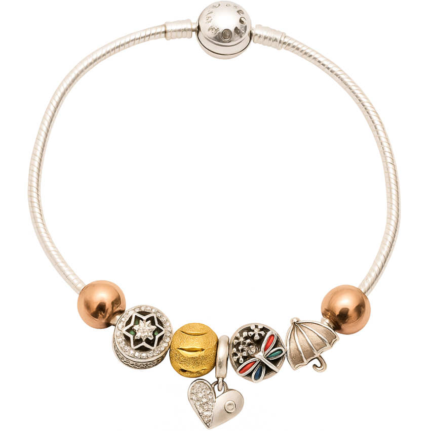 The Hearts Spell bracelet is a refined blend of elegance and storytelling. Crafted from sleek silver with subtle rose-gold accents, this bracelet features a series of unique charms—each one narrating a different facet of life's journey. A shimmering heart, a golden kiss bead, a multicolored butterfly, a protective umbrella, and a star-framed crystal all come together in perfect harmony. Its graceful simplicity and charm diversity make it a symbol of love, joy, dreams, and protection—floating like a celestial ring, light yet deeply expressive.