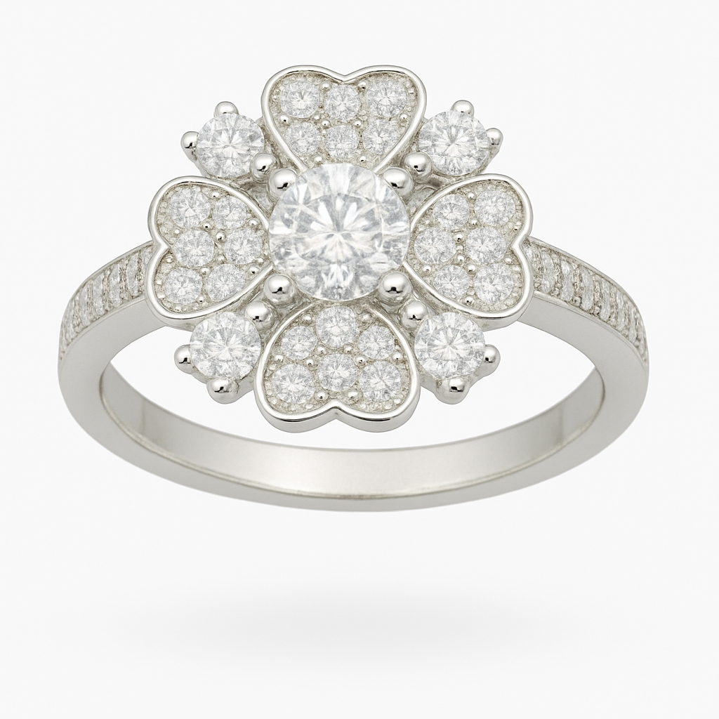 This radiant silver ring is a true celebration of intricate craftsmanship and romantic symbolism. The top view reveals a dazzling floral cluster composed of heart-shaped petals, each set with shimmering stones. At the heart of the design lies a brilliant round center stone, surrounded by smaller gems that enhance the ring's radiant symmetry.