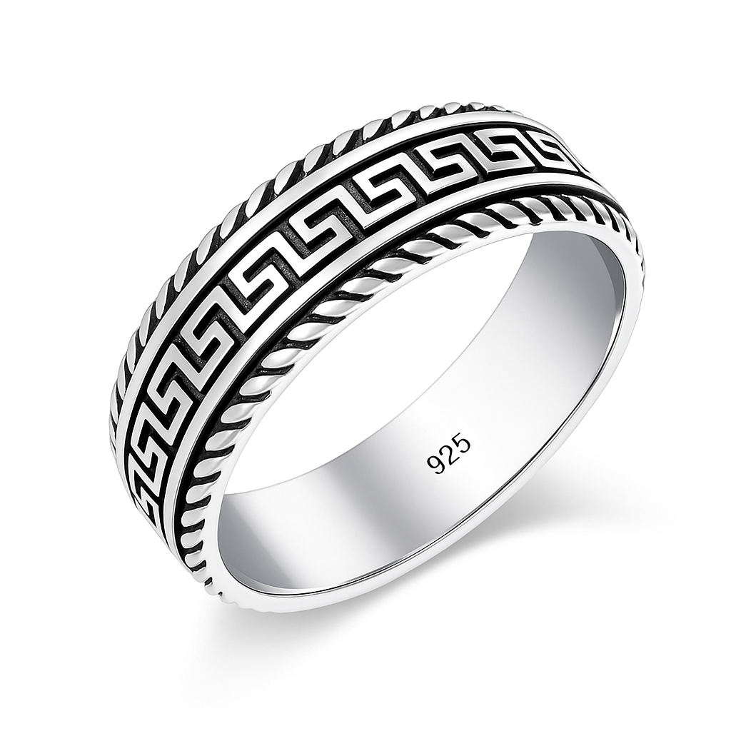 The Hellenic Twist Ring blends classical heritage with bold detail. Featuring a striking Greek key pattern at its center, this sterling silver ring is bordered by twisted rope-style edges that add texture and dimension. The polished silver and oxidized black contrast give it a timeless, structured look — perfect for those who appreciate ancient art with a modern edge.