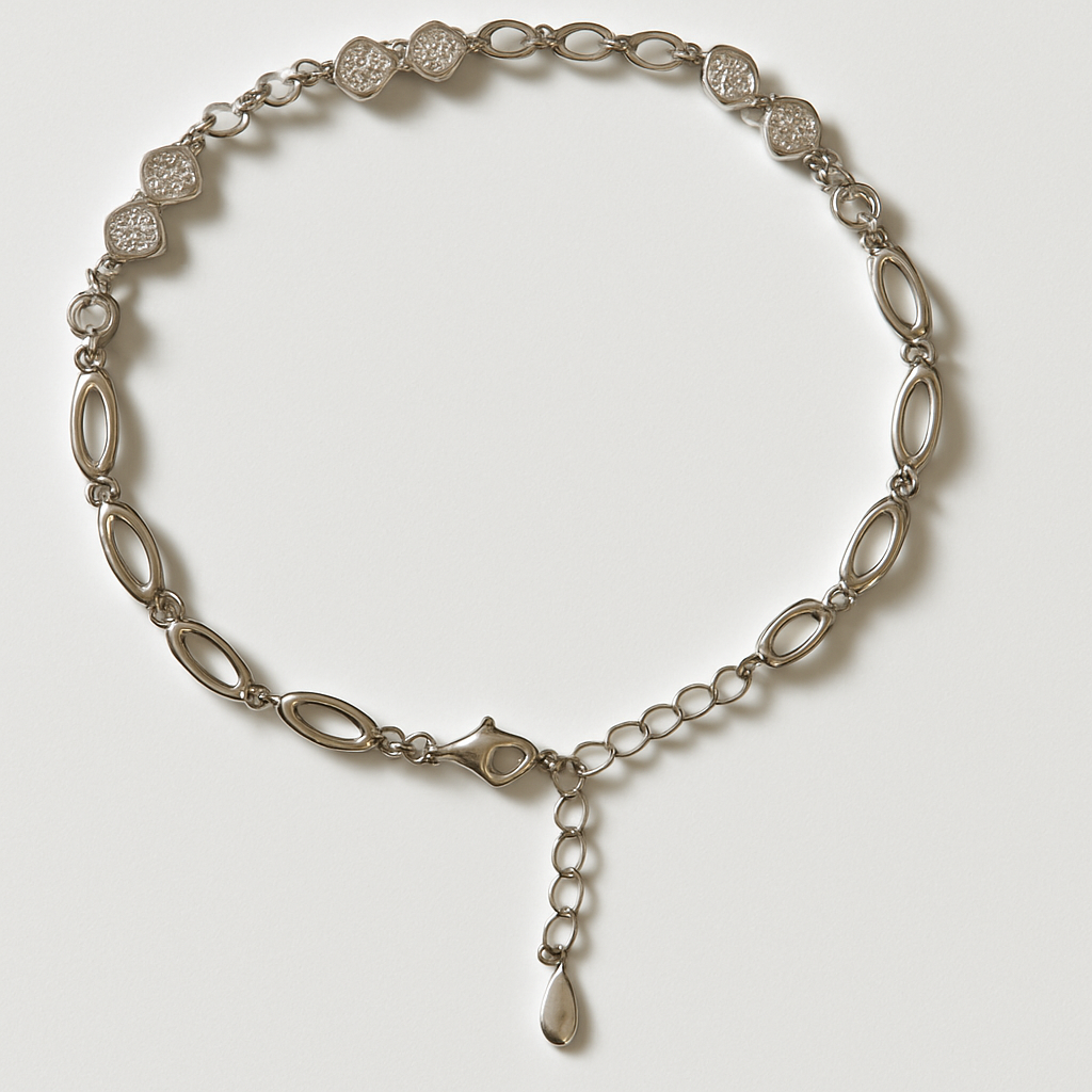 The LatticeLink Bracelet features a graceful blend of open oval and textured diamond-shaped links, joined by polished connectors that create a fluid, balanced silhouette. Crafted in sterling silver with a delicate extender chain, this piece offers an elegant combination of structure and sparkle — perfect for adding refined charm to any outfit, whether layered or worn solo.