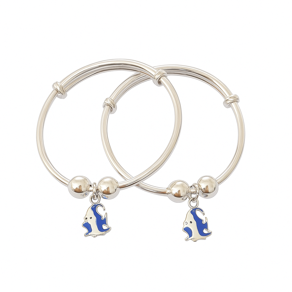Little Whales is a charming pair of silver baby bangles featuring smooth round beads and playful blue whale-shaped enamel charms. Lightweight and polished for comfort, these kangans bring a touch of fun and sparkle to tiny wrists — perfect for gifting or everyday adorableness.