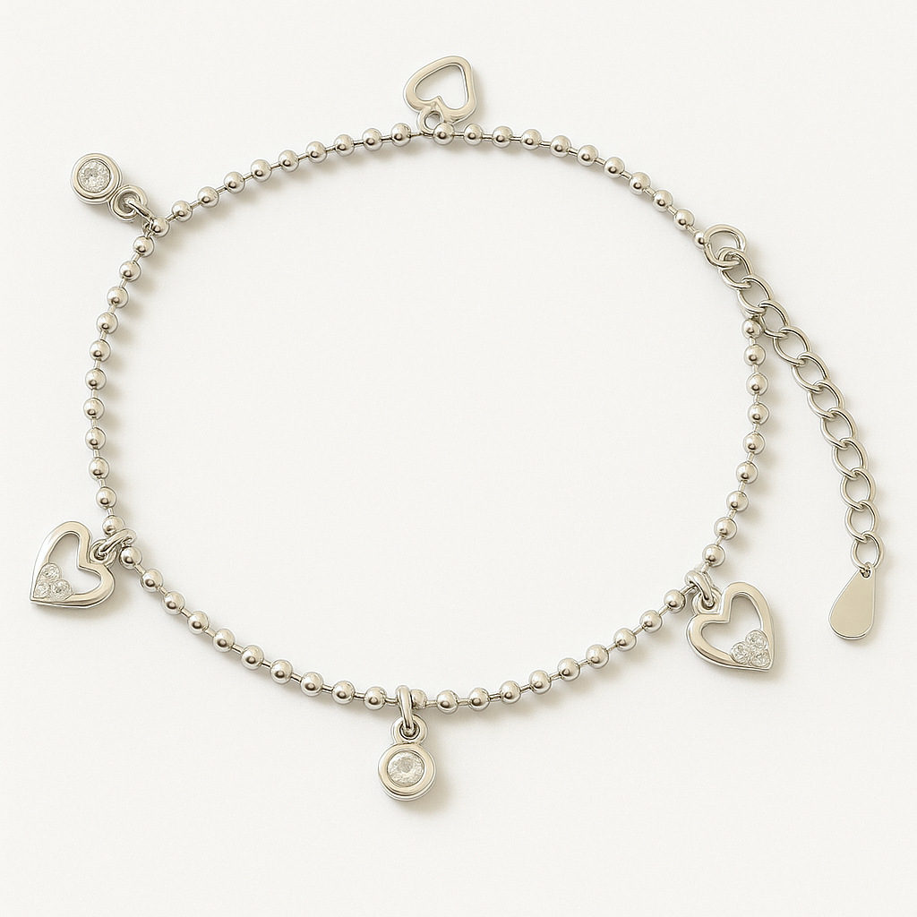 The Loving Dots bracelet features a polished silver beaded chain adorned with sparkling heart charms. Light, elegant, and full of charm, this piece blends minimalist detail with romantic expression — perfect for everyday wear or meaningful gifting.