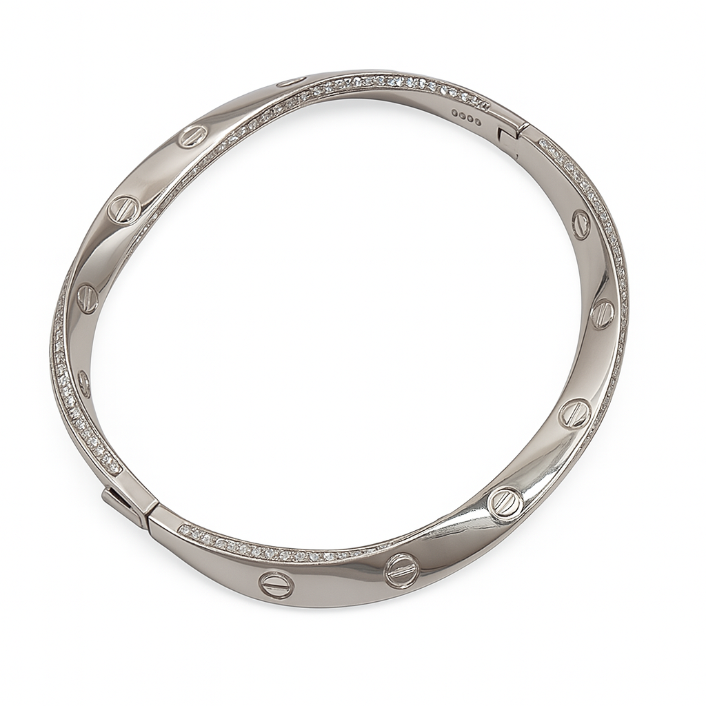 The Luxe Bangle is a sleek and modern silver bracelet featuring a bold screw-head motif around its polished surface. Accented with subtle rows of sparkling stones, this piece blends industrial edge with refined elegance. Crafted in high-quality silver, it’s the perfect statement accessory for those who appreciate minimalist sophistication with a touch of brilliance.