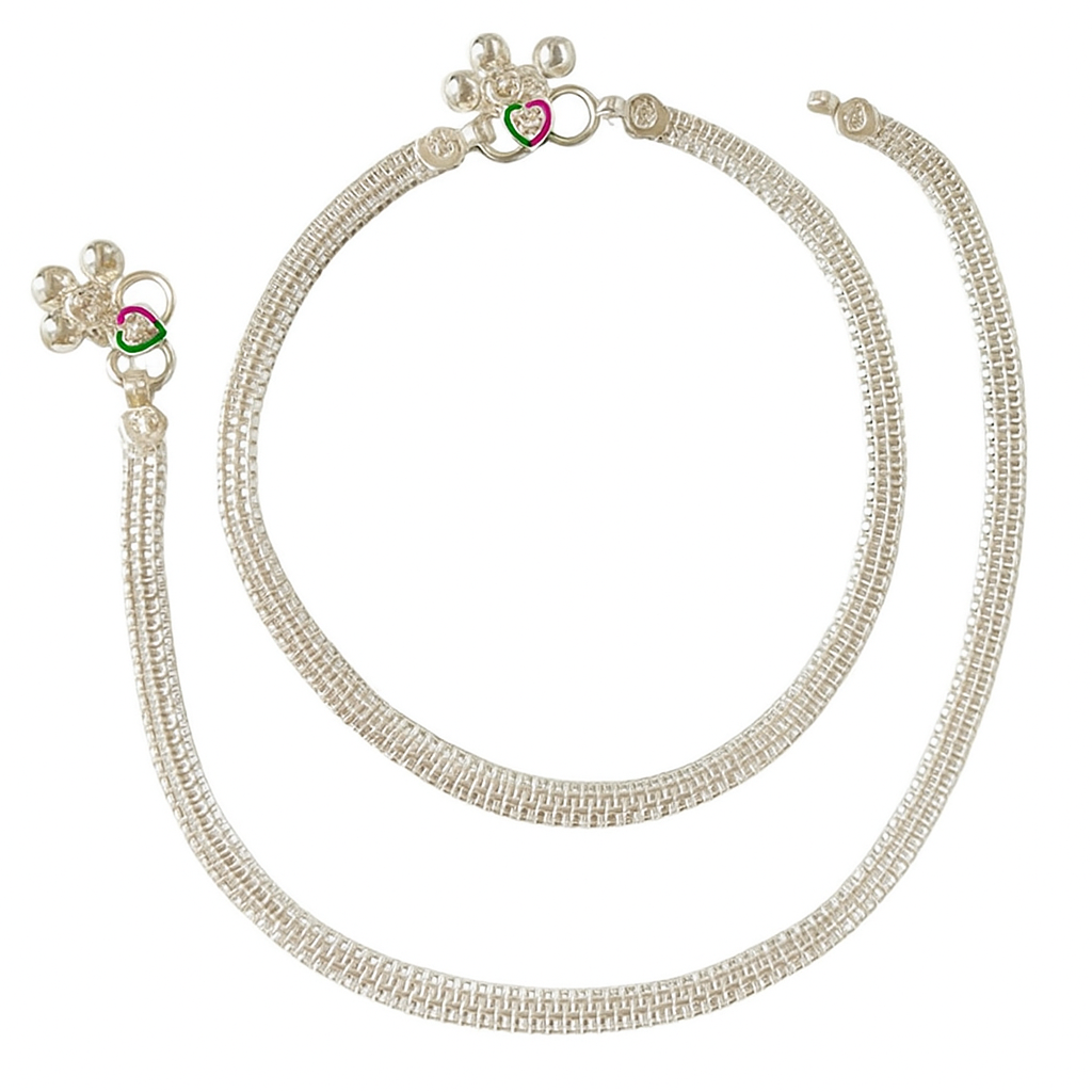 This silver anklet features a refined mesh link chain that gracefully wraps around the ankle. Accented with a charming heart-shaped clasp adorned with vibrant enamel detailing, it blends traditional craftsmanship with a touch of modern elegance. Perfect for everyday wear or special occasions, its symmetrical design and polished finish offer both comfort and timeless appeal.