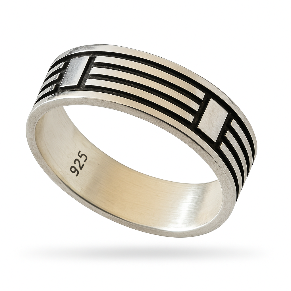 The MetroLine Ring features a clean, modern design inspired by urban geometry. Crafted in sterling silver, the band showcases a series of engraved black lines and polished rectangular blocks, giving it a bold architectural look. Its sleek profile and minimalist detailing make it a perfect everyday piece for those who appreciate structure, symmetry, and timeless style.