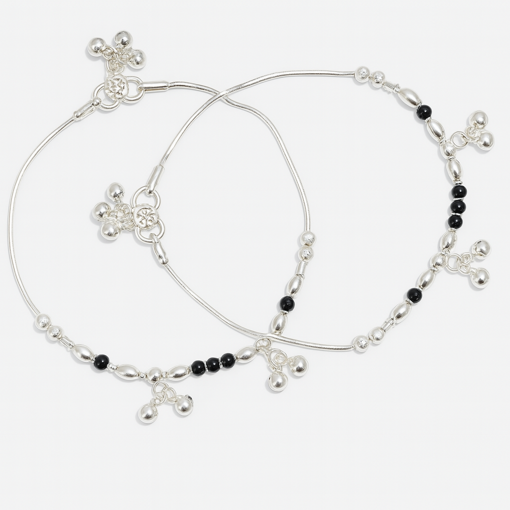 Midnight Bells is a handcrafted silver anklet featuring polished silver beads accented by sleek black stones. The delicate clusters of silver bells add a soft jingle with every step, making it a perfect blend of bold contrast and graceful charm.