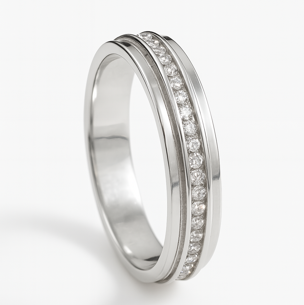 Sleek and timeless, the Minimal Band features a polished silver band with a refined channel of shimmering stones running cleanly through the center. Bordered by raised, smooth edges, this ring blends minimal design with a touch of sparkle — perfect for those who value elegance with subtle brilliance. A versatile piece suited for both everyday wear and special occasions.