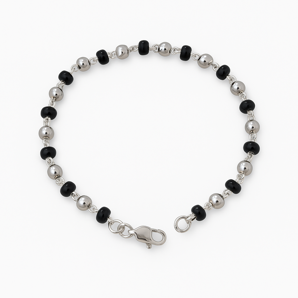 The MonoLink bracelet features a clean rhythm of polished silver and black beads, linked together in a timeless pattern. Its sleek clasp and minimal design make it a versatile accessory — perfect for everyday wear with a subtle edge.