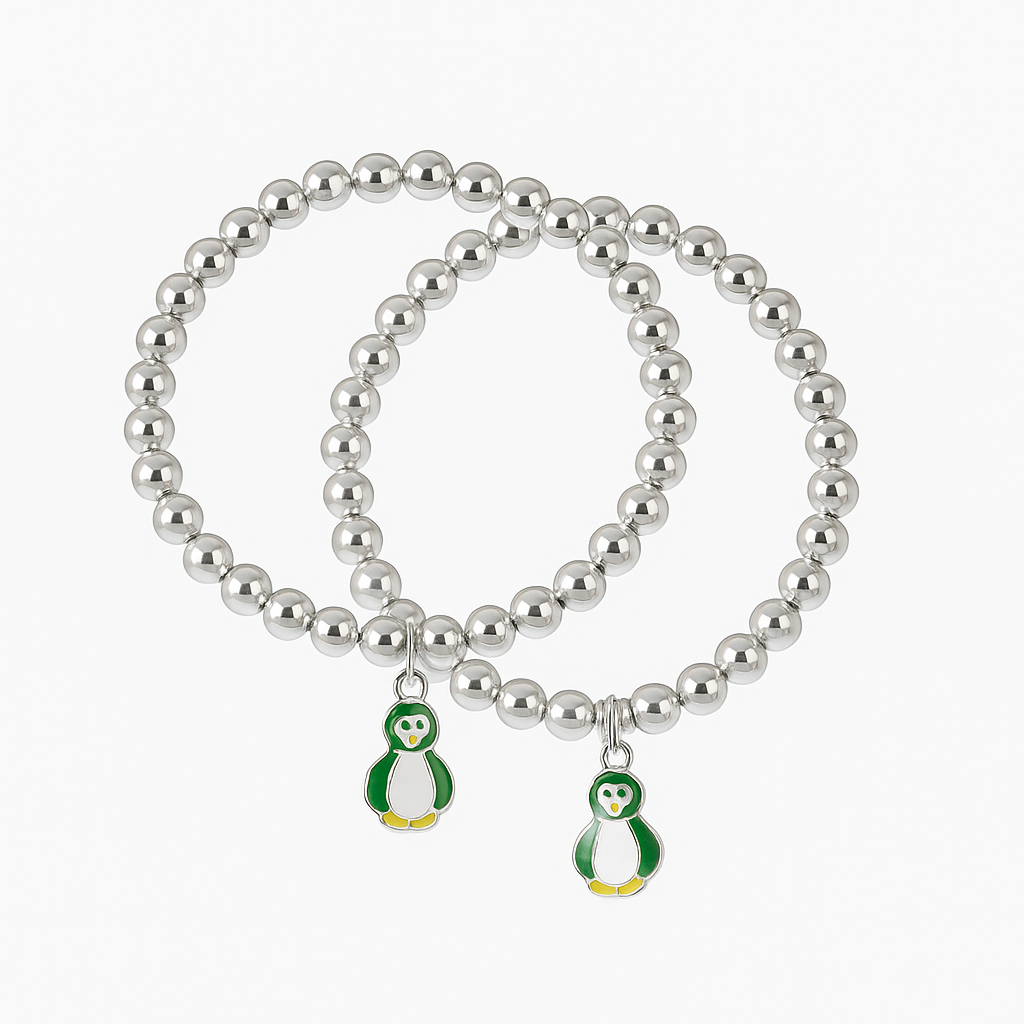 Penguin Pals is a playful pair of silver beaded baby kangans, featuring smooth polished balls and a charming green penguin charm. Designed for little wrists, these kangans blend cuteness and comfort with a joyful character kids will love.